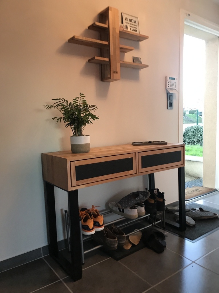 Belle console! mais il faudra expliquer aux enfants (et aux plus grands), que désormais, avec ce beau meuble fait par papa, les chaussures doivent être bien rangées!