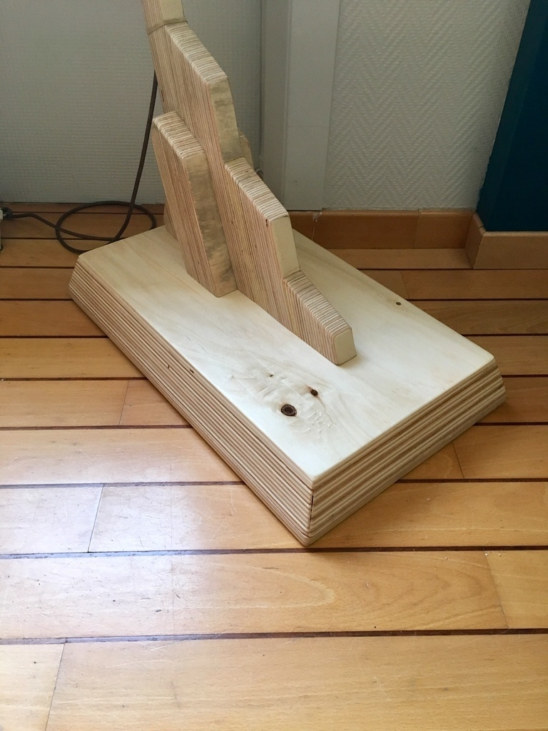 . Socle fait d’un chaperon en béton, enfermé dans le bois! Abat-jour origami de chez Maison du monde! Rajout au bout d’une semaine d’un filin en acier qui court le long de l’arc pour éviter qu’elle descende ou que je finisse par lui mettre le feu