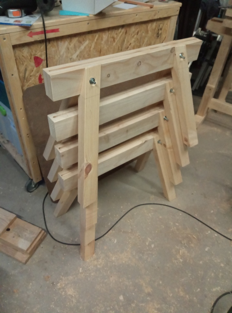 Merci Terkou attention, ce sont des petits tréteaux, si tu en fais des plus hauts, pense à mettre des traverses entre les pieds ou du CP, comme le conseille plus haut Boisbarbu