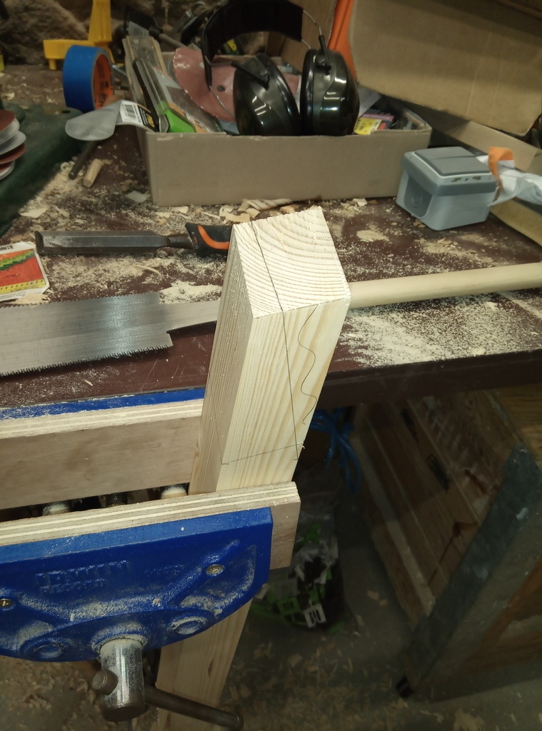 Les pieds ont un angle composé par rapport à la verticale, d'où épure (assez simple pour les connaisseurs et les charpentiers, mais bon, c'est bien de mettre en pratique) donc quelques coupes à la scie à main et rectification au rabot et au ciseau.