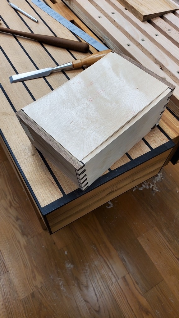 Rainure arrêtée accueillant le fond en noyer. La rainure est même inclinée sur les côtés en noyer pour suivre l'angle.