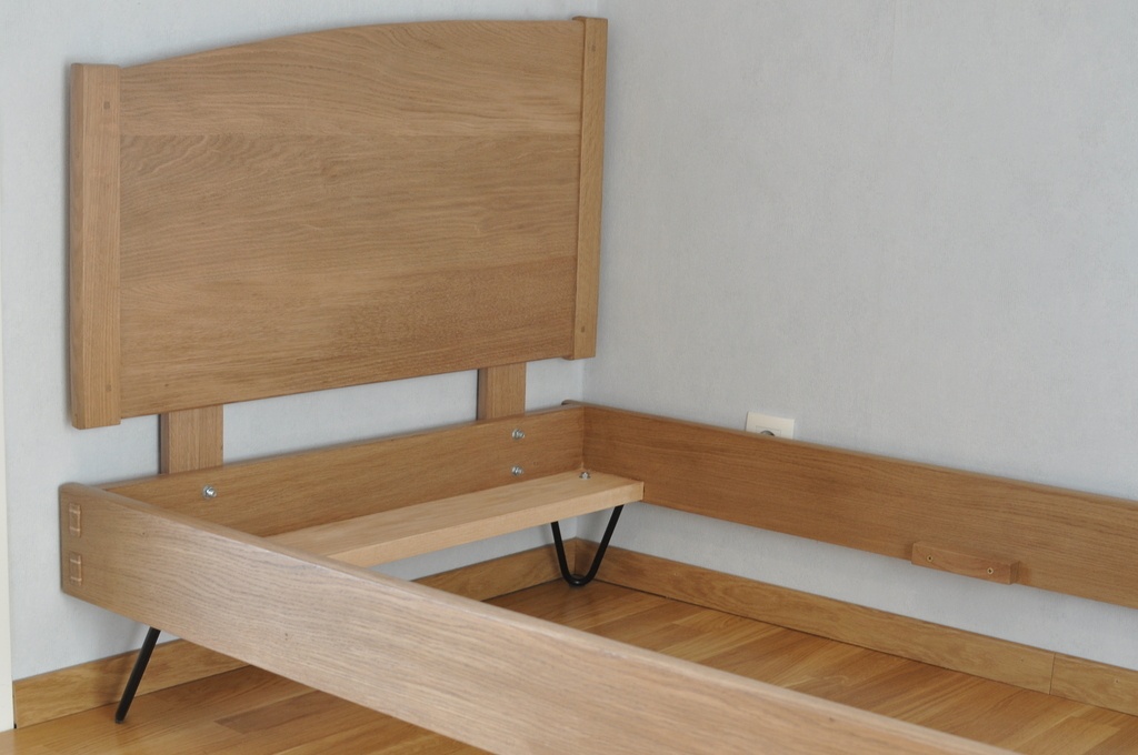 Le cadre du lit est assemblé avec des tenons traversant avec coins, et est inspiré de celui d'Ishitani.
