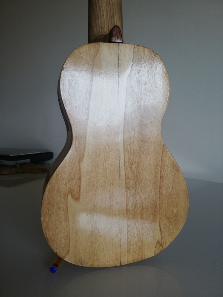Un ukulélé de plus dans les catalogue des créations du site! Il est constitué entierement de matériaux de récup (hormis l'accastillage) dos, table d'harmonie et éclisses sont en bois de cagettes récupérées sur le trottoir après le marché, le manche est un bout de chêne que j'avais dans mon stock depuis 15 ans, la touche et le chevalet, probablement du sipo, étaient dans mon stock de bois de récup depuis aussi longtemps que le chêne. Pour les finitions, j'ai simplement utilisé de l'huile de Tung pour manche et touche, et un vernis marine brillant pour la caisse. Je me suis vraiment amusé dans cet essai de lutherie et comme j'ai construit les différent gabarits et moules pour l'éxécution, j'envisage dès maintenant d'en faire d'autres!