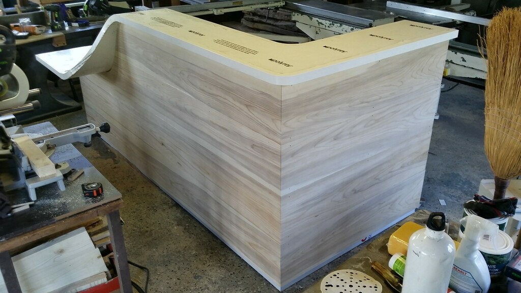 C'est ça, c'est que je proposais, un seul morceau pour la partie plane du bureau en bas en continuité de la vague et pour la partie plan haut/mange debout. Regardes si tu peux réaliser dans une même plaque de placage tout le bureau, la vague, le plan haut, avec une fente pour séparer la partie bureau de la vague-plan haut.