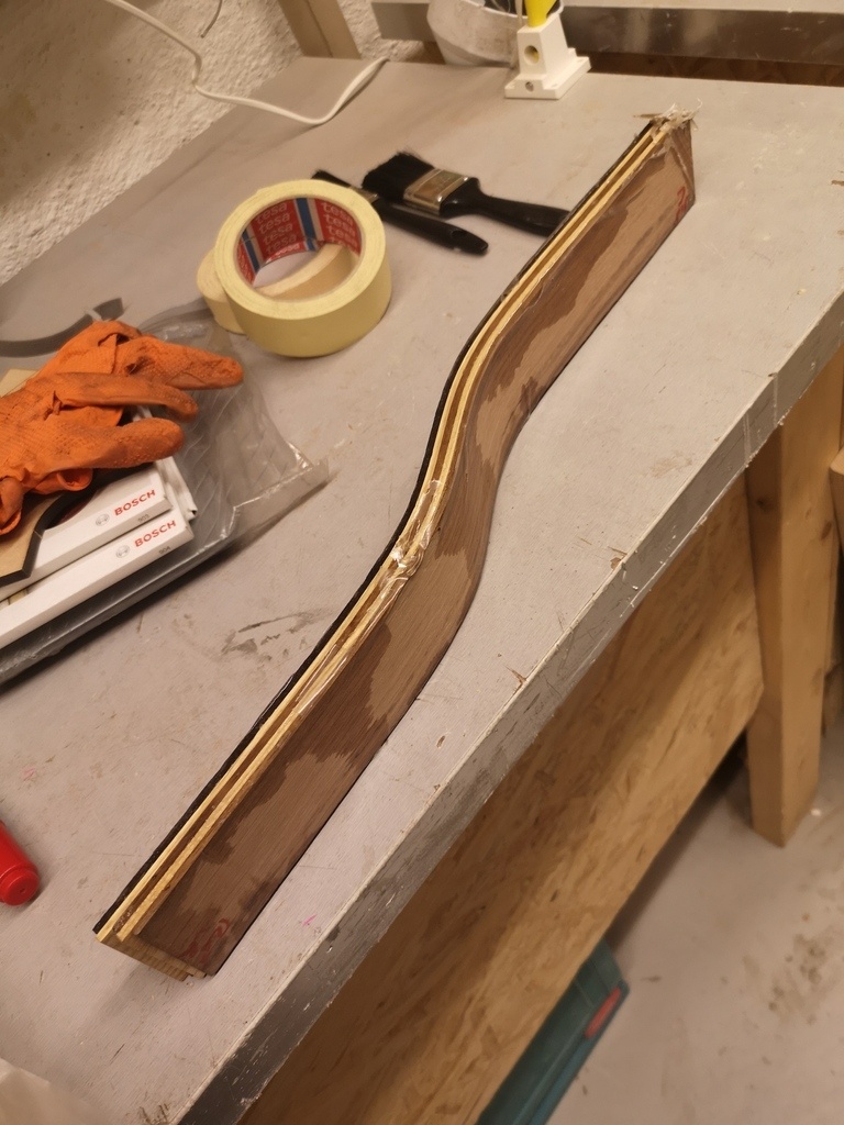 Pendant que le cadre principal est sous presse, il faut s'occuper les haubans et des bases. J'ai raboté des planches à 3.4 mm, 5 couches par montants. J'ai fabriqué des moules pour le pliage.