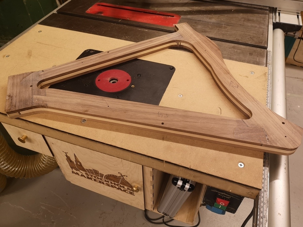 J'ai réalisé deux patrons dans du MDF de 6mm, un pour la géométrie externe du triangle principal, et un pour le défonçage de la partie interne.