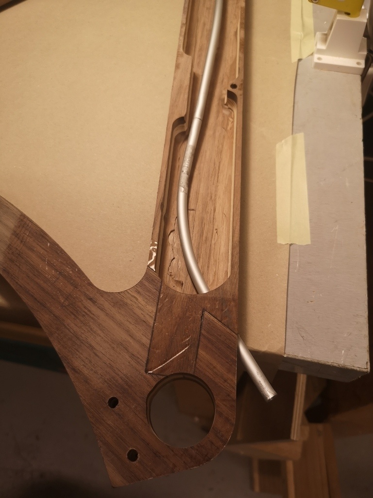 Avant de refermer le cadre pour de bon, j'ai passé des tubes en aluminium de 8mm pour plus tard passer les gaines de freins arrières, et de dérailleurs. C'était très délicat de percer avec un angle si prononcé dans le cadre. les tubes étaient aussi peu évident à plier et insérer.