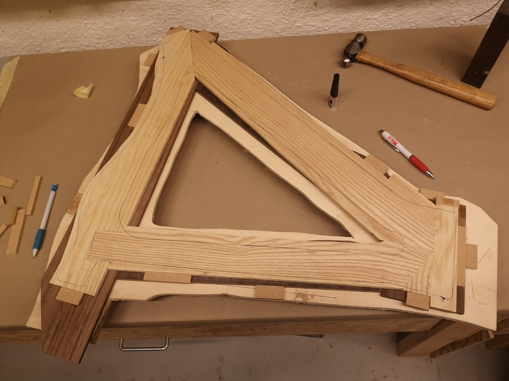Une fois toutes les planches prêtes, je les découpe pour former le triangle principal. Je fais en sorte que les joints entre les planches se recouvrent pour éviter d'affaiblir le cadre.