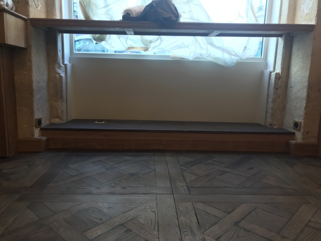Pose du plancher collé, dalle contrecollé Versailles en provenance de Belgique, poncé teinté huilé avant la pose