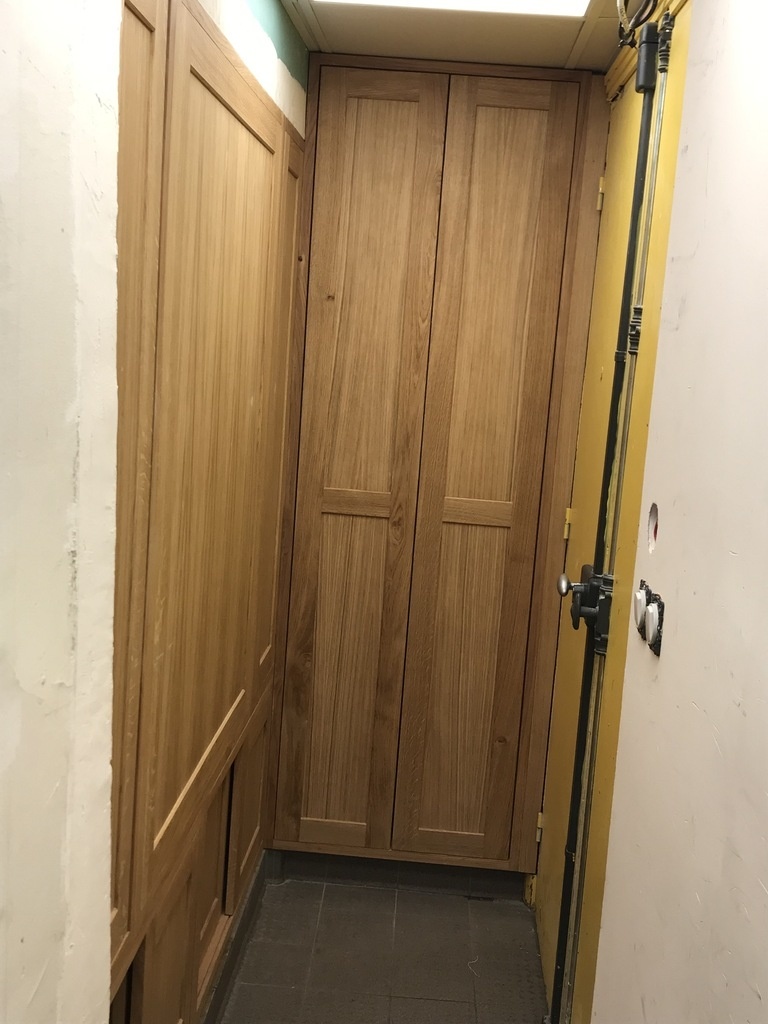 Une salle de 15 m² à habiller de boiserie, mobilier, porte à galandage, poutre, corniche, plafond, meuble wc, porte de cuisine et ... ainsi que de petites réalisations qui n'en font q'une