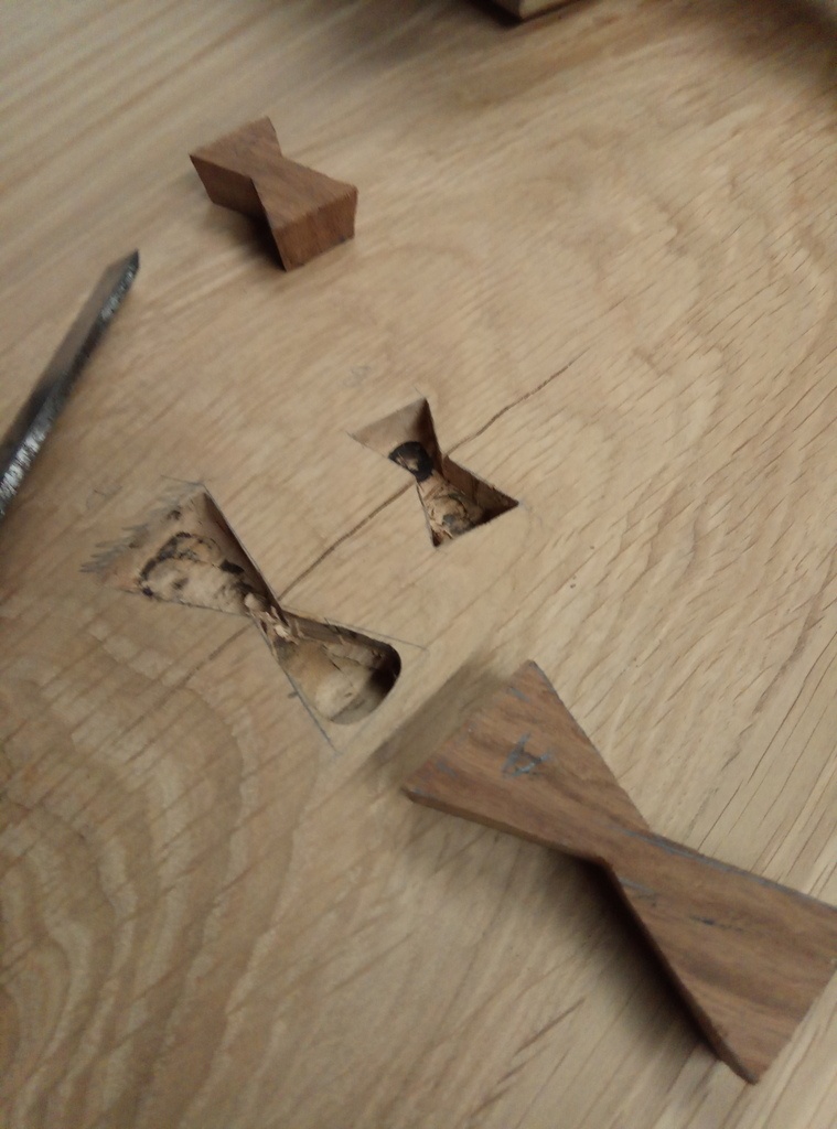 Un élément était partiellement fendu, donc incrustation de deux papillons en chêne rouge.