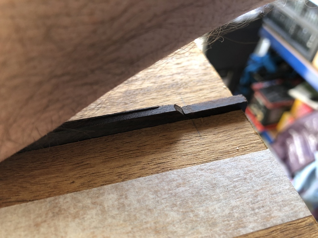 J'insère une très fine lamelle d'ébène et jointe avec un mélange de colle et de la si salissante poussière noire de ce bois.