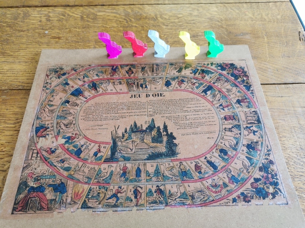 - Un jeu de l'oie : oies chantournées dans du pin et le jeu imprimé avec un transfert au vernis
