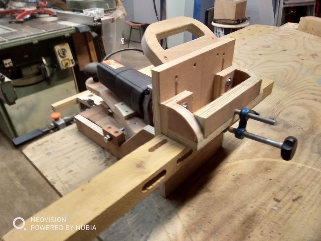 voila j,avais récupéré il y a quelque a n'ai ce moteur de défonceuse ,et la javais a faire des mortaise sur une poutre poser , et regardent sur le net j'ai vue différant modèle , et j'an n'ai fait un a mon idée le premier axe est sur deux coulisse horizontale et l'autre qui supporte le moteur pivote de droite a gauche , et j'ai rajoutée un système de serrage
