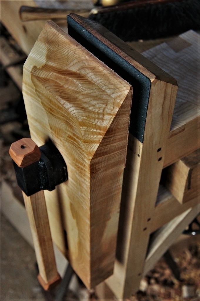 La poignée est en frêne, et les abouts, vissés, en cormier. 2 pièces de cuir ont été collés pour un meilleur grip, et moins abîmé les pièces serrés. C'est l'éclate à réaliser, ça va servir très souvent, et c'est un très bon exercice de taille d'assemblages, encore une fois. J'ai rajouté une petite difficulté en le faisant trapezoïdal, mais droit, ça fait le même job.