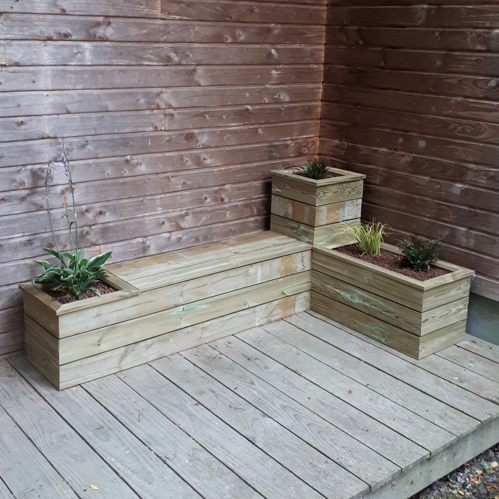 Un meuble multi-fonctions pour aménager l'entrée de la maison. C'est entièrement fait en lames de terrasse de GSB (et des vis, toutes cachées à l'intérieur). Coupe d'onglet à tous les coins. Les fonds des jardinières sont en pente avec un film plastique percé dans le bas pour l'écoulement du trop plein d'arrosage.