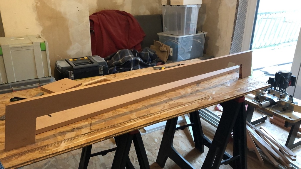 J'ai ensuite fait la coupe pour le pied du lit, et les arrondis pour le coté du lit d'enfant. Tout cela a la défonceuse, avec le guide parallèle pour le pied du lit, et avec deux gabarits en mdf pour les arrondis.