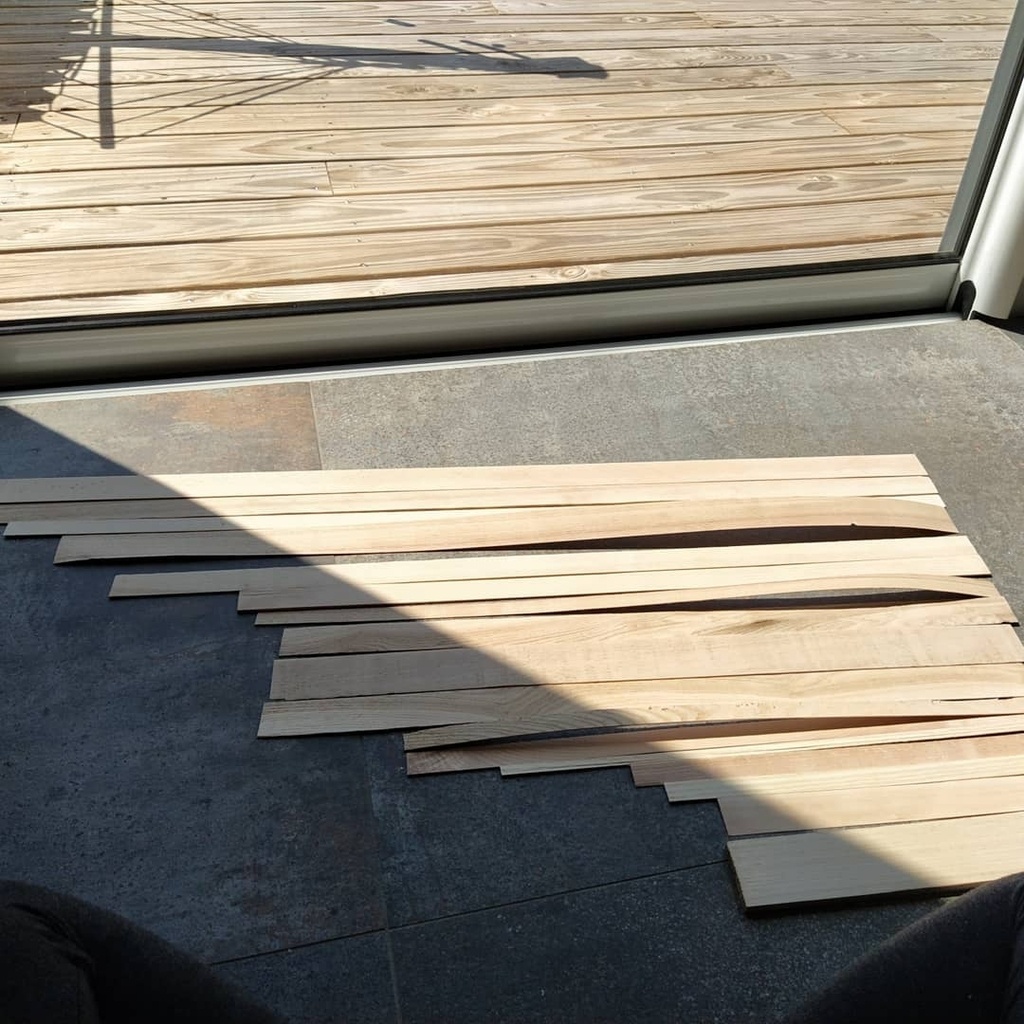 Récupération de lamelles de bois de différentes essences, longueurs et épaisseurs (on voulait faire des tests). Plus le morceau est épais, plus il est important d'avoir un trait de coupe parallele au sens des fils du bois sinon, ça casse !