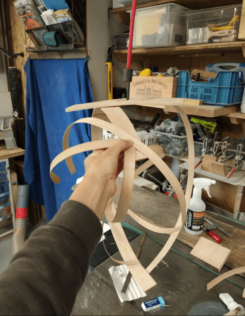L'idée était de faire un lustre, on avait pas mal de tes petites lamelles donc c'était assez simple d'adapter la courbure (et même pas très utile pour les plus donnés d'utiliser le cintrage vapeur).