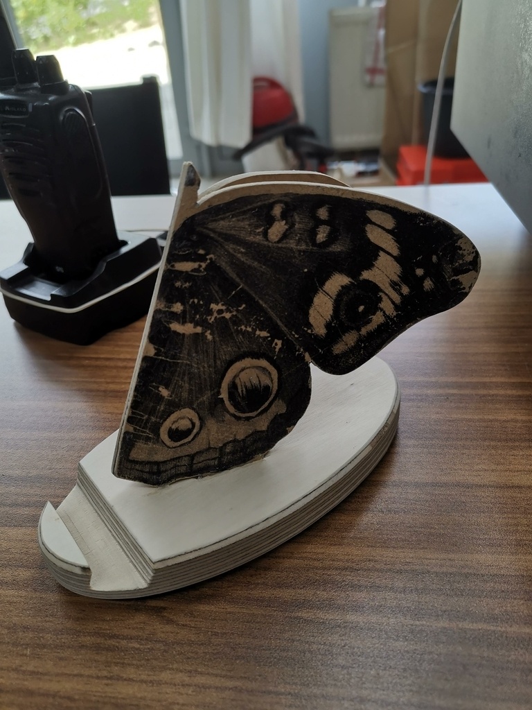 Les ailes du papillons sont équipées d'un tenon (simple découpe rectangulaire) qui est venue s’emboîter dans les deux petite mortaises faites dans le socle...