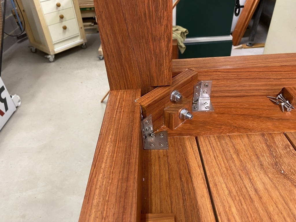 Réalisation d'une table pour l'extérieur en padouk massif, les dimensions: longueur 155cm sur 95cm, hauteur de 79cm. Les pieds sont démontables pour rentrer/ranger la table pour l'hiver. La quincaillerie est en inox. Cette table est très similaire à une réalisation précédente. Vous pouvez regarder une vidéo youtube via le lien suivant : youtu.be/8A_xkSiUK88