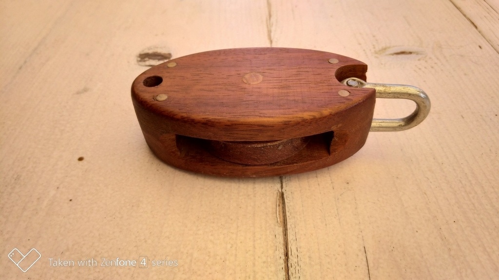 J'adores ce genre de poulie. Tu aurais plus de détails sur la réalisation ? Comment as tu fixé l'anneau ? Le cordage sort directement d'un trou dans la poulie (a droite)? Tu n'as pas peur de l'usure du bois ?