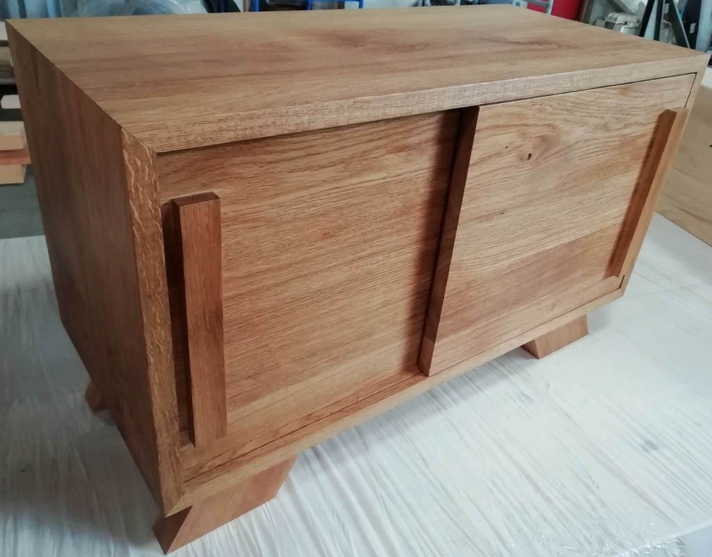 Les pieds sont simplement des pièces de chêne corroyés/rabotés puis tronçonnés avec un angle de 30°. Ils sont ensuite assemblés au plateau bas grâce à des vis à filetage partiel.