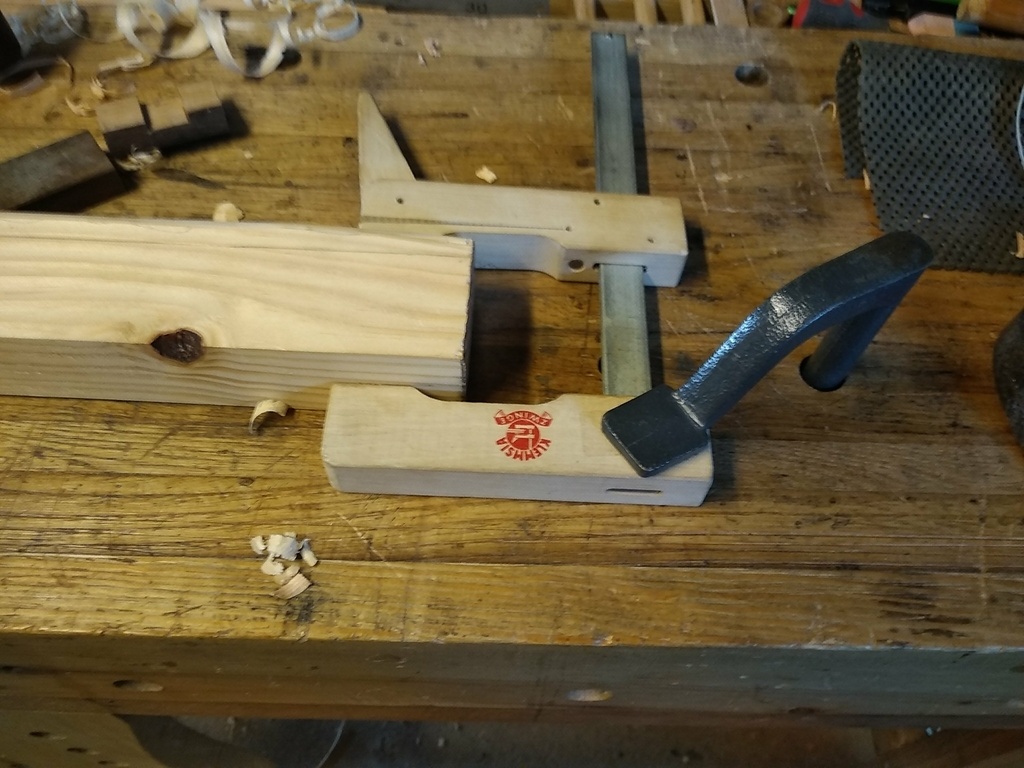 Rien de plus simple en fait : un (ou deux c'est mieux) serre joint en bois de ce type (ou à faire soi même) et une cale en bois pour rattraper le vide sous le rail, une encoche légèrement moins épaisse que ce même rail et une cale pour venir bloquer le tout à l'aide d'un valet !