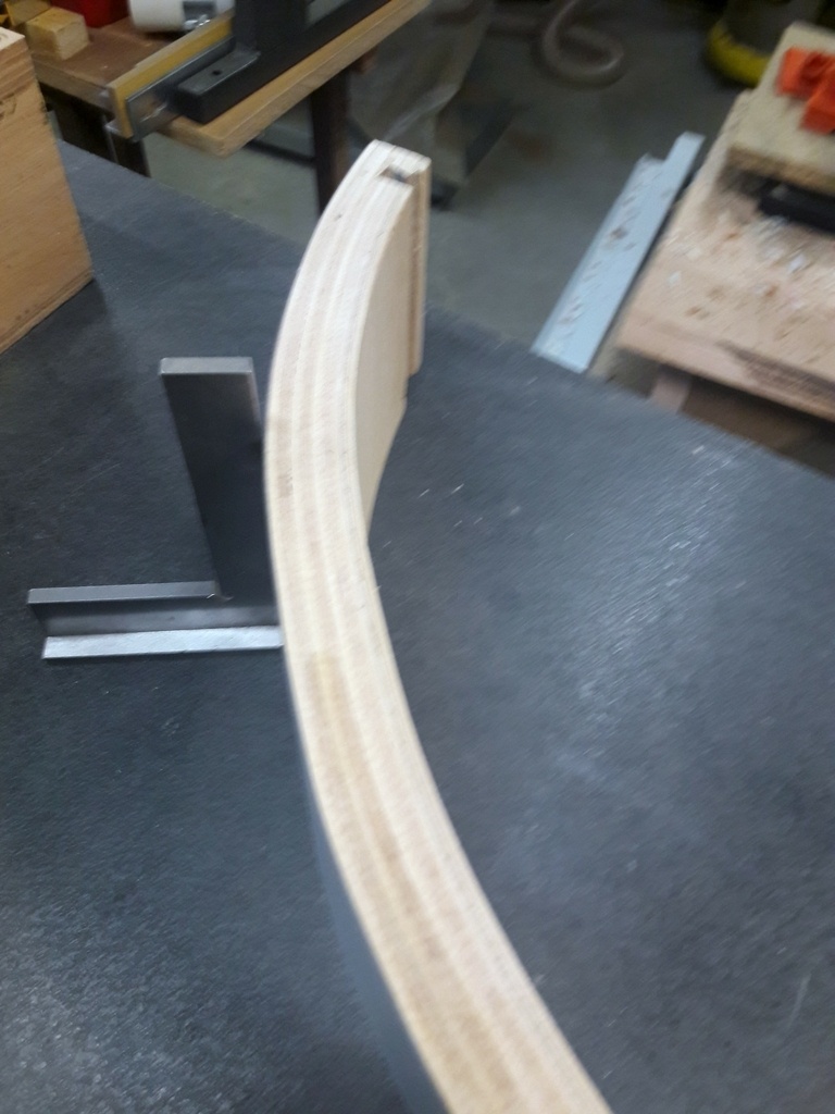 On voit bien sur les photos suivantes que la pièce est gauche. Il y a peut d'écart par rapport à l'équerre mais ça saut aux yeux. Et en plus le quart de rond gondole légèrement, avec une courbe pas très régulière.