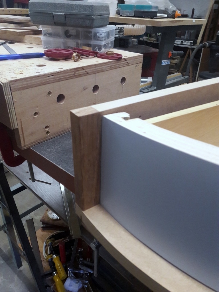 trente six seb pour le guide souple, c'est vraiment un excellent outil à condition d'éviter les cassures... La défonceuse sur compas t'évite ce problème pour une pièce circulaire.pour éviter que ta rainure débouche et ne pas faire de façade rapportée, tu peux faire une rainure en queue d'aronde arrêtée à la défonceuse. Pour le jeu, sur ta première photo on voit la façade de tiroir avec du jeu côté pivot et sans jeu côté poignée (ou effet d'optique peu être. Enfin tous mes conseils sont pour toi à l'avenir et dans un but constructif et bienveillants bien sûr