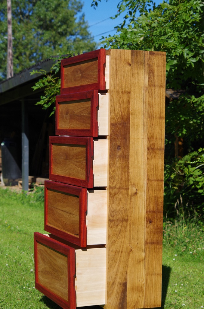 ), j'ai eu envie de faire une commode dans le même style. Il me restait des chutes de chêne de ma table qui étaient bien sympa niveau veinage. Du coup le projet n'a pas trainé à voir le jour.Seul différence, cette fois les cadres sont en padouk (plus de wallaba à la scierie !). En espérant qu'en vieillissant les deux essences se ressemblent !