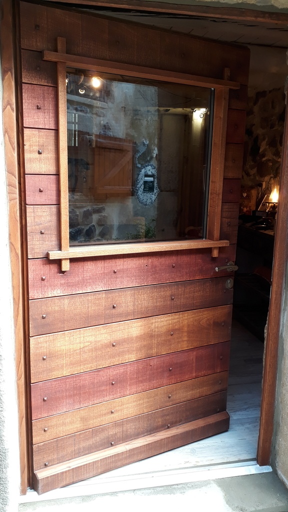 Porte d'entrée réalisée avec une ossature traditionnelle en massif recouverte de lames de 15 mm à l'extérieur comme à l'intérieur pour l’esthétique.