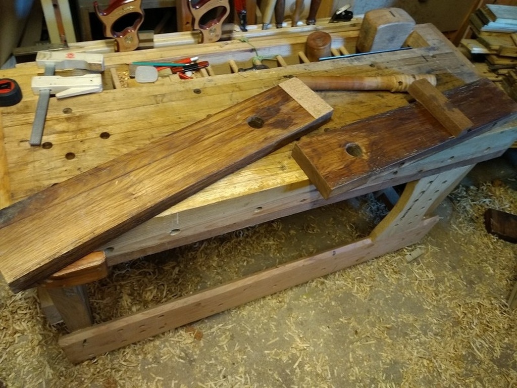 Donc quand j'ai fabriqué mon établi en m'inspirant d'un site anglais qui s'inspirait lui même d'un livre de Roy Underhill (je n'avais pas vu au début, je regardais que les images!), il n'y avait pas de presse mais un crochet.