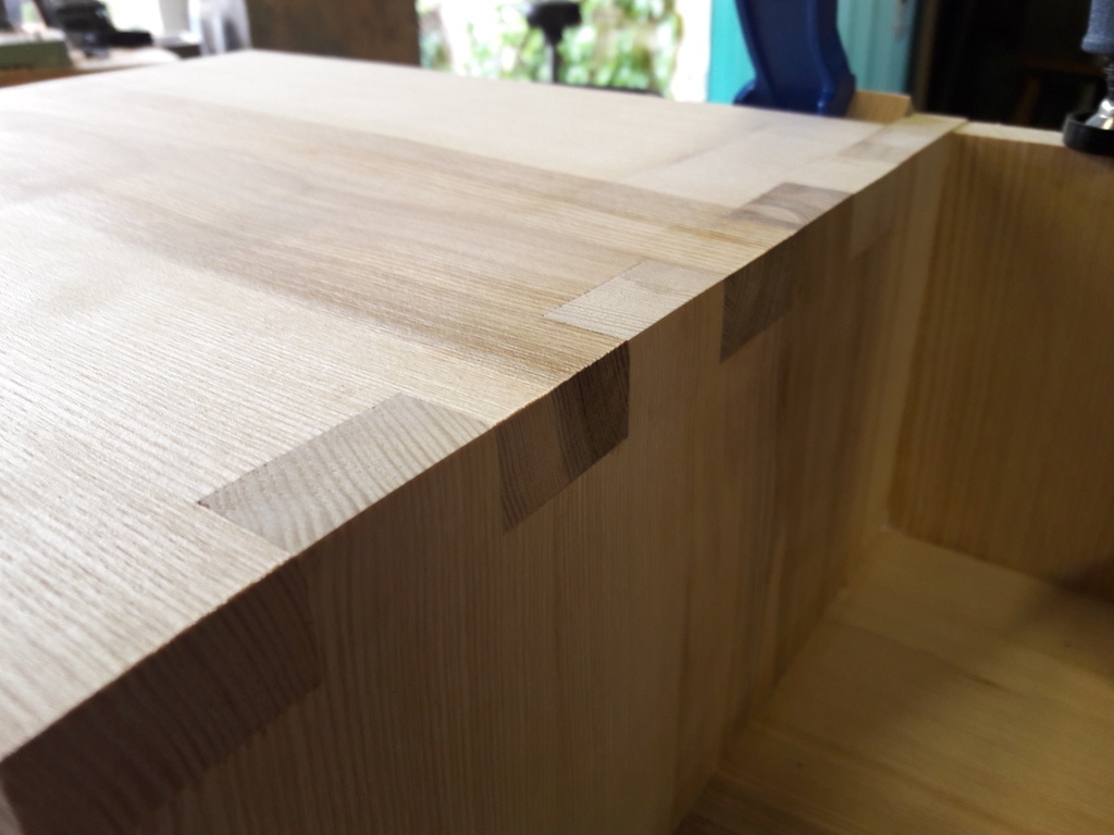 Pour les tiroirs, là encore une première pour moi : j'ai décidé de les assembler en queue d'arondes à la main. C'est l'occasion pour moi de remercier tous les boiseux sur ce site et d'autres, qui par vidéos et tutos transmettent leur savoir-faire ! Il me reste une immense marge de progression et je n'étais pas totalement satisfait du résultat, mais très content d'avoir essayé ! Egalement, puisque les tiroirs coulissent dans le caisson ouvert par un côté, j'ai voulu faire une petite taille au ciseau à bois pour pouvoir les agripper facilement à l'ouverture et ainsi laisser la façade épurée.