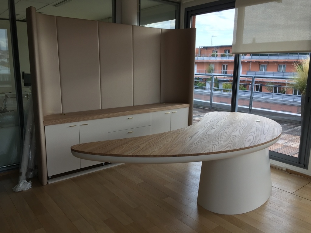 Très joli, presque organique! l'ensemble avec le mobilier à l'arrière est très harmonieux! je sais pas si j'oserai travailler dessus!