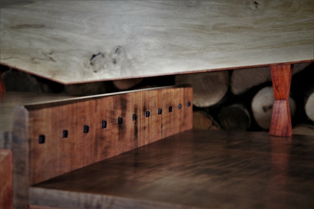 Ça ne laisse pas indifférent tout ces détails entre la construction tourillonné les bois tourmentés la géométrie des panneaux et du socle. J'aime beaucoup les montants latéraux filants. Un poil chargé à mon goûts mais sacré travail! chapeau! Une photo du meuble equipé par curiosité?