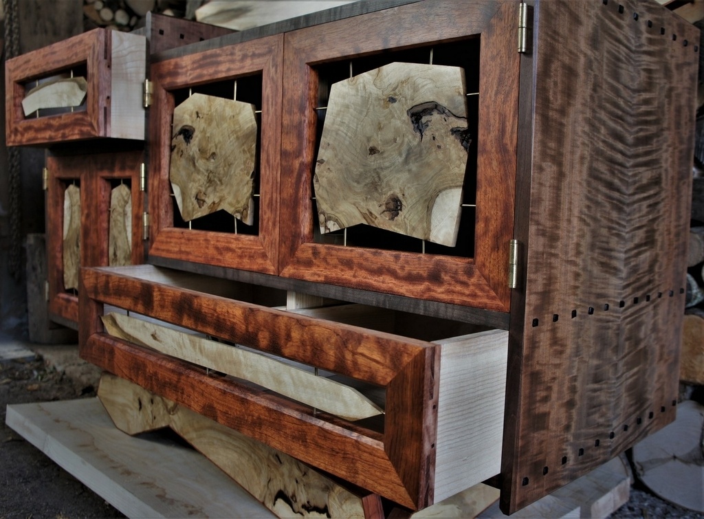 L'idée était de mixer des formes géométriques un peu aléatoires suspendues avec du charme truffé de défauts que j'avais récupéré chez un agriculteur du coin, mais franchement joli avec de magnifiques couleurs, avec du bien carré et du bois bien droit de fil et figuré (ici du kevazingo pour les portes et de l'alisier pour la caisse). A savoir que les figures moirés du kevazingo sont très courantes sur beaucoup d'essences exotiques sciées au quartier, on la voit très régulièrement sur l'iroko, le movingui, le makoré etc etc...