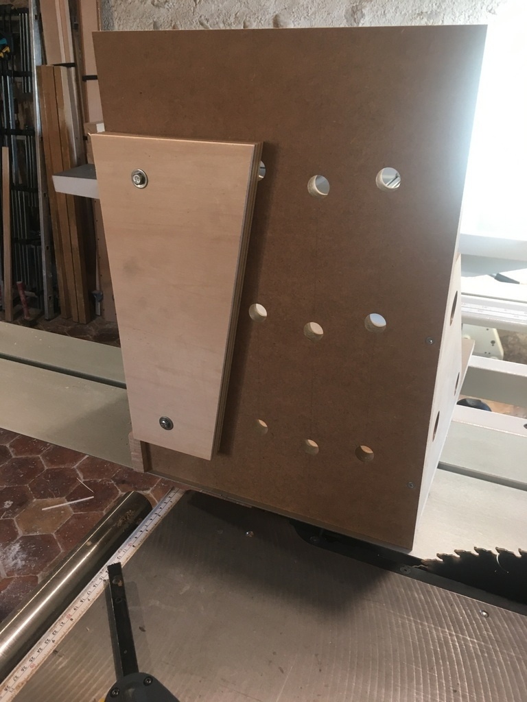 L'usinage de l'enfourchement a intégralement été réalisé à la scie à format. Pour ça j'ai repris mon gabarit de coupe verticale.