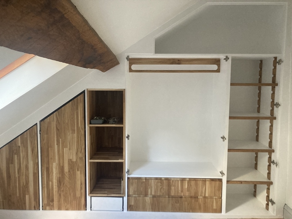Le but ici était de faire un espace de rangement fermé adapté aussi bien aux vêtements qu'aux petits objets (de la paire de chaussure à la valise).