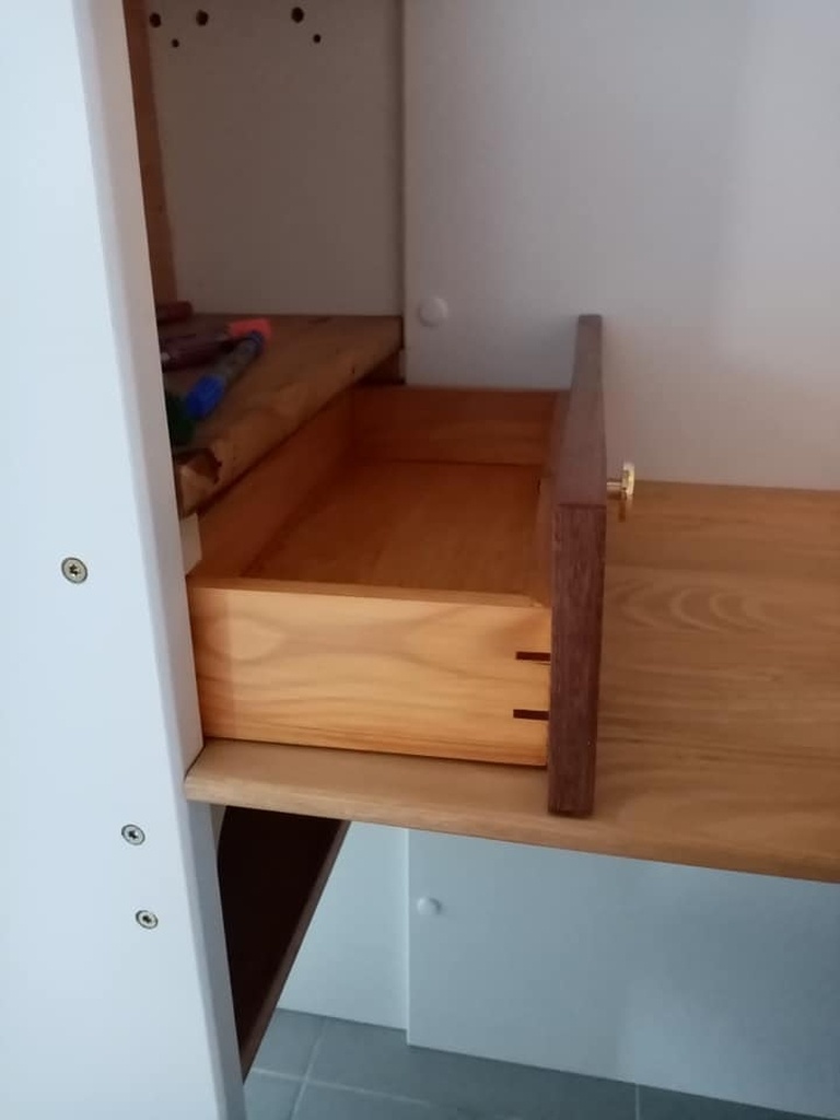 - Le petit tiroir a un cadre en bois de palette, une rainure pour un fond en CP, découpe/collé a 45° avec un renfort latéral en bois exo. La façade est un "test" assemblage (de CP de palette) à chevron que j'avais fais l’année passé et qui correspondait parfaitement. J'ai juste collé des languette de bois exo pour un côté plus "fini"