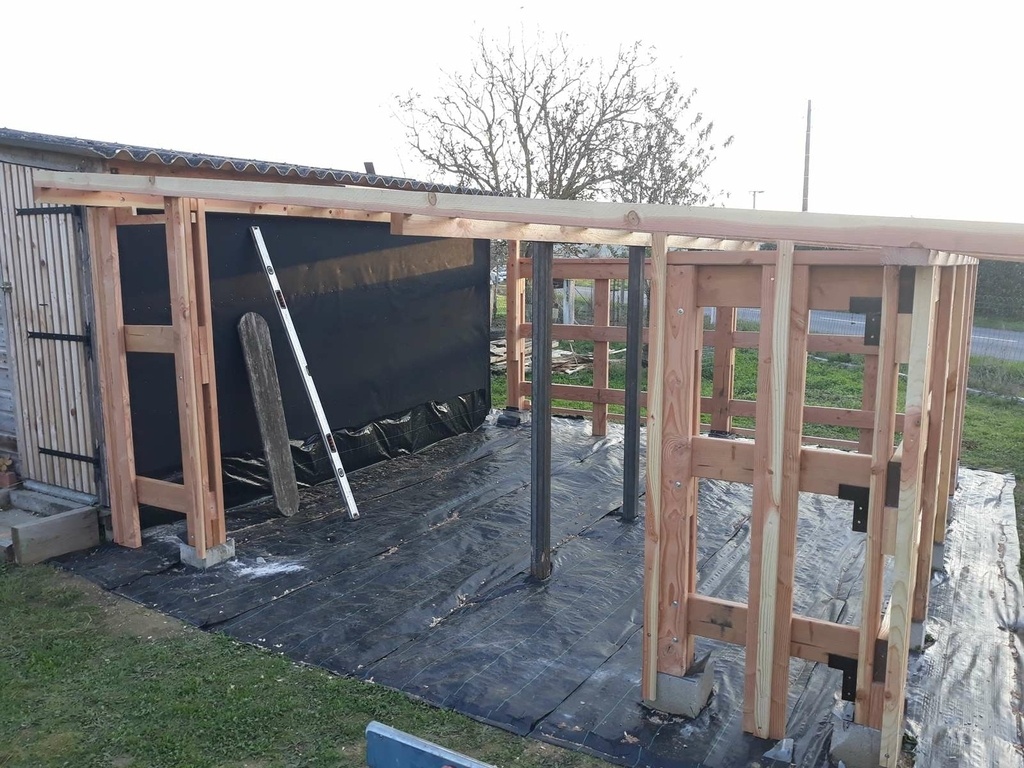 Coté structure bois, équerres en acier 50x50 en 5 mm, faite maison, apprentissage de la soudure à l’arc. Il y a 6 mois je ne savais rien faire et je ne pratique pas tous les jours, donc du temps et du temps et … du temps oui !
