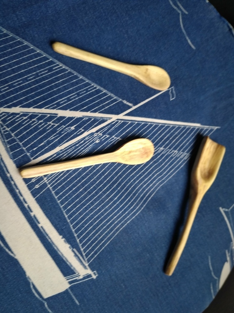 Une spatule en bouleau, des noeuds pap dont un en platane, des cuillères musicales, des tournes pouces.
