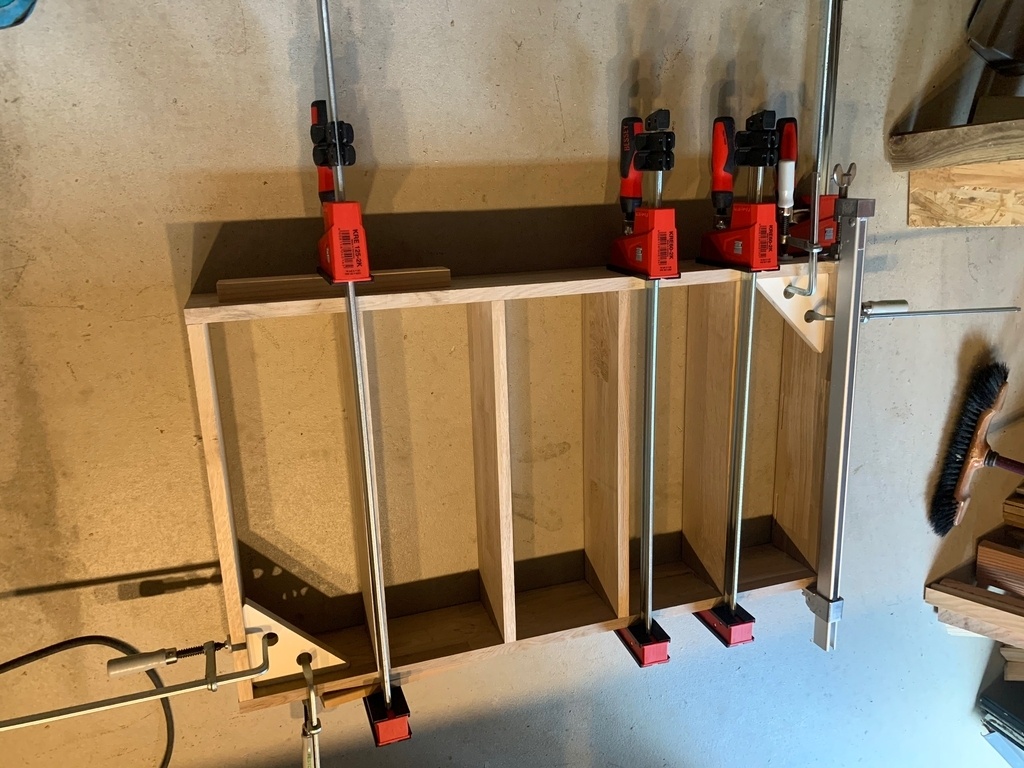 Fabrication de rangements pour une salle d'eau :Panneaux de chêneAssemblage par lamello et collagePortes sur pivots laitonFinition rubio