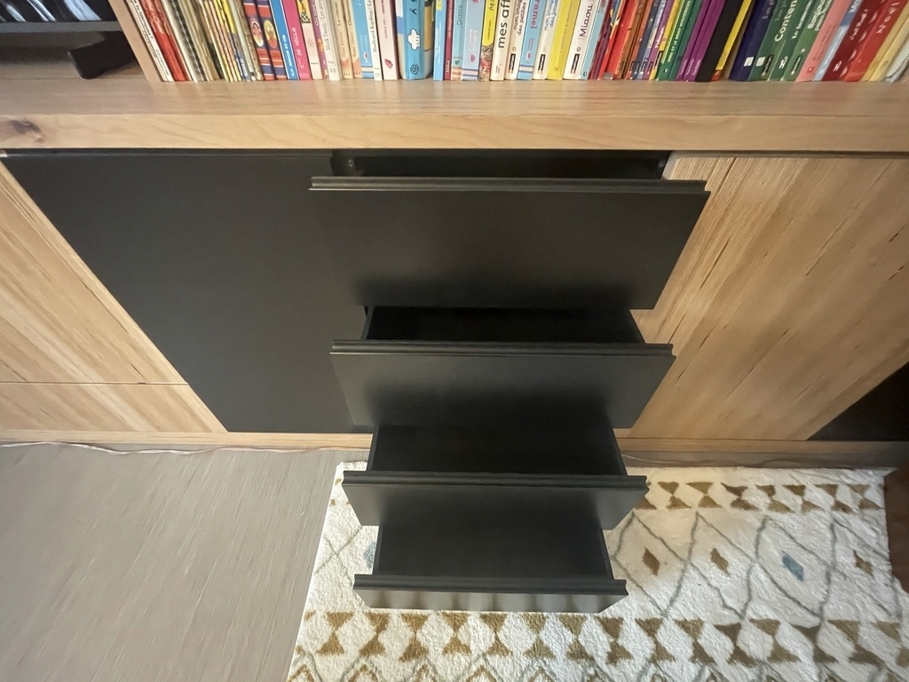 Au final, après pas mal de boulot, je suis assez fière de lui fournir ce meuble. Il en est très content et il a déjà bien rempli celui-ci.