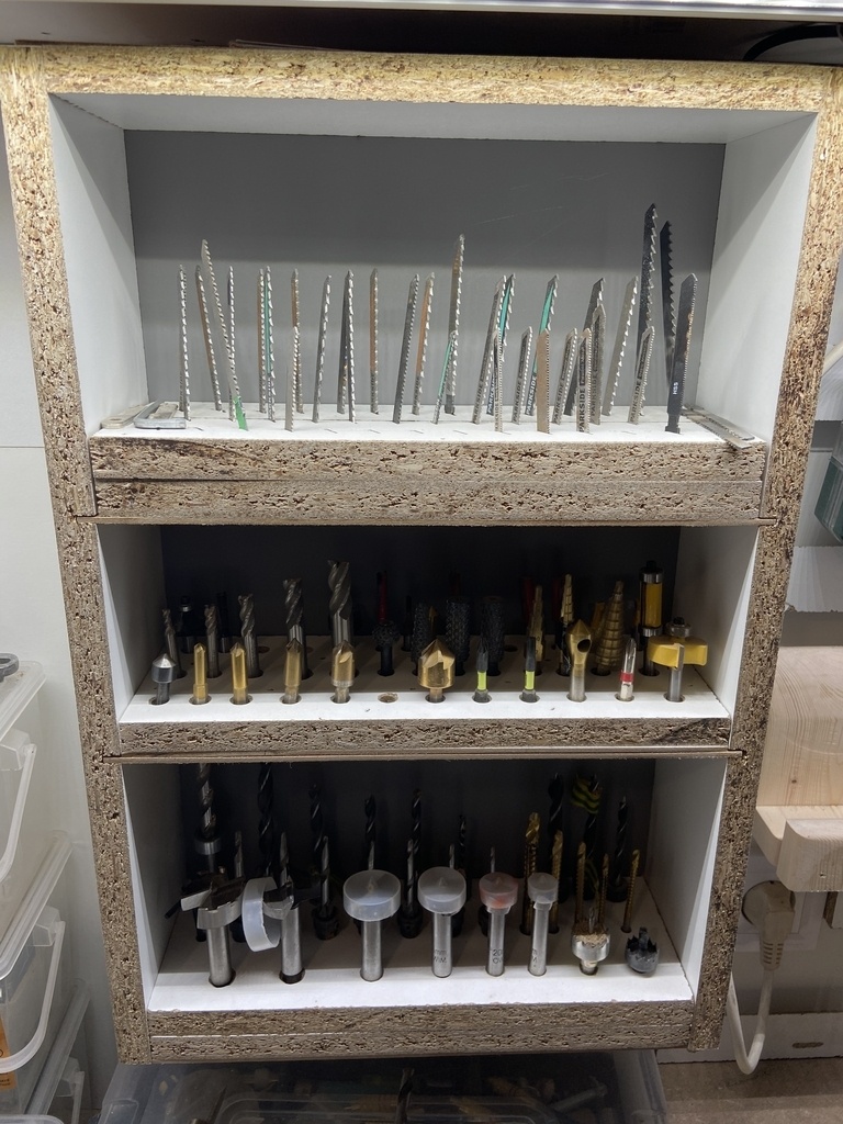 Voici un meuble French Cleat pour mes forêts, défonceuse, perceuse etc.