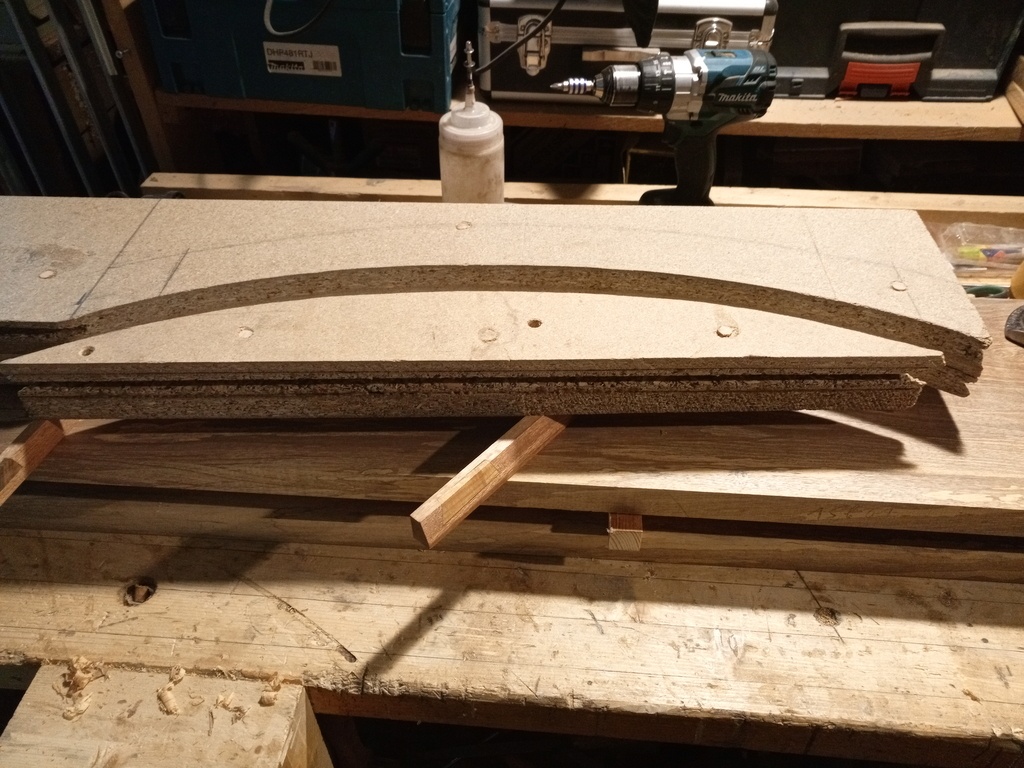 Pour une des traverses du piètement, je me suis amusé un peu à faire du lamellé collé, j'ai d'abord préparé les moules et contre moules avec des chutes de panneaux.