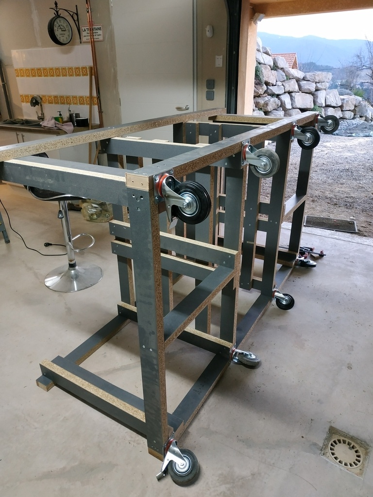 cela faisait un moment que je rêvais d'un établi roulant très long et surtout avec une scie sous table intégrée .... voici chose faite. Encore plus ravi d'avoir recyclé du matériel improbable. Pourquoi roulant ? et bien pour bricoler au choix dans le garage ou dehors au soleil ;-)