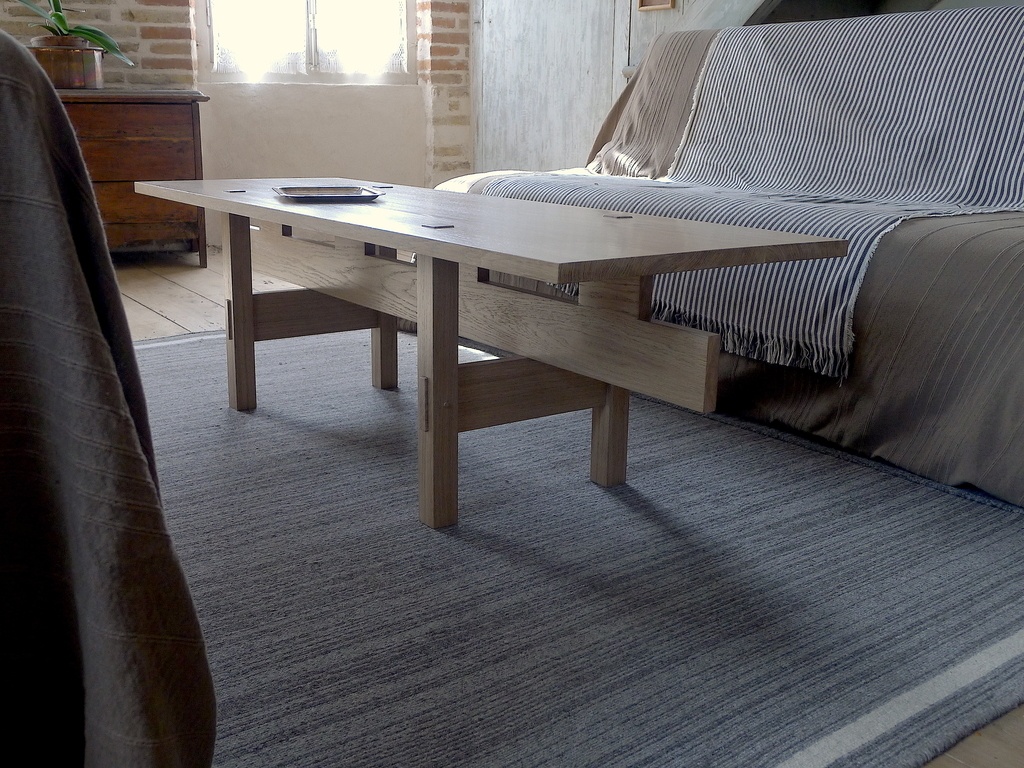 Table basse en Chêne massif inspirée d'un banc de 3 mètres de l'architecte danois Ib Kofod-Larsen. "L'extrusion" sous la table empêche tout fléchissement du plateau. Pour obtenir des chevilles avec un léger chanfrein, une demi-cheville façonnée est enfoncée de chaque côté avec une garde pour unifier le dépassement. Le piètement et l'extrusion sont chevillés ensemble.
