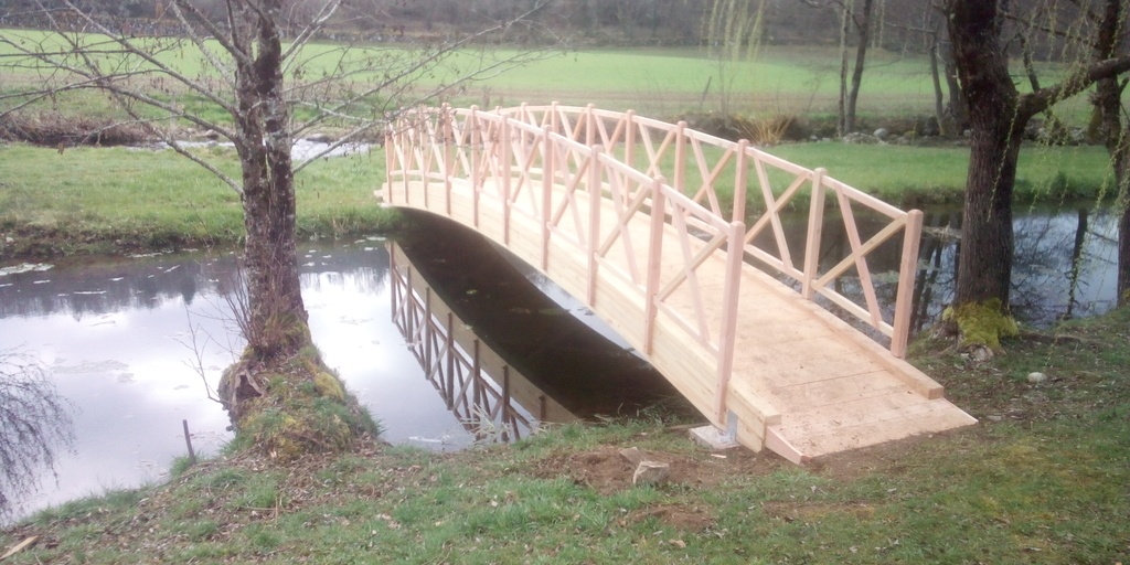 merci pour les retours je vais donner quelques precisions. tout d'abord je n'ai pas fait de calcul precis au niveau des charges il y a deux poutres cintrees de 36 x 13 environ ca ma semblé honnete. elles sont assemblées a partir de planches rabotées a 2 cm toujours pas de calcul a mon avis 3 ca passait. les planches font 3m30 environ juste decalées et biseautées a 45deg en bout (ce qui est insuffisant mais ca tient) et collées a la pur d4 501.6 avec tiges filetées tous les 40 cm pour le serrage (finir par serrer en bas) ( 4kg de colle par poutre). espace entre poutres 1m10 mini avec plancher brut de 3.5cm sur tasseaux. il ya trois croix (mi bois) sous le pont (pas tres utile mais ca tiens un peu l'aplomb). quatres plots beton avec juste bande d'etanchéité et equerre ext pour futur réglage. je n'ai pas calculé la balustrade . assemblage en amont deux traverses une croix tout en mi bois , mortaises des poteaux avec un peu de jeu vertical et coupe de longueur des traverses sur place. juste du xylophene pour l'instant ( douglas un peu blanc) mais le client aime bien tout passer au saturateur. sinon pour passer les poutres sur l 'étang voir dernière photo juste tiré au treuil. on devait me preter un manitou mais raté le moment( ah quels beaux engins)