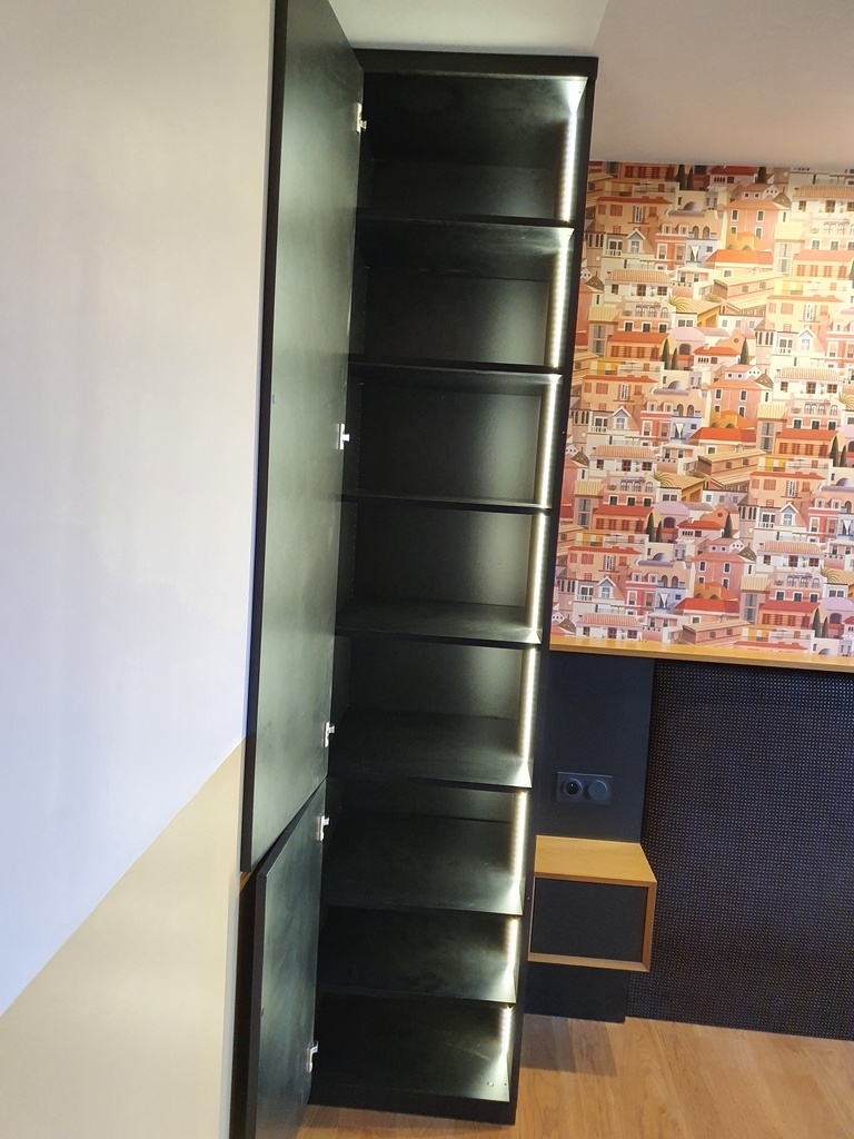 Le chêne c'est du panneau plaqué. Et les l'éclairage est un ruban Led avec détecteur de mouvement.